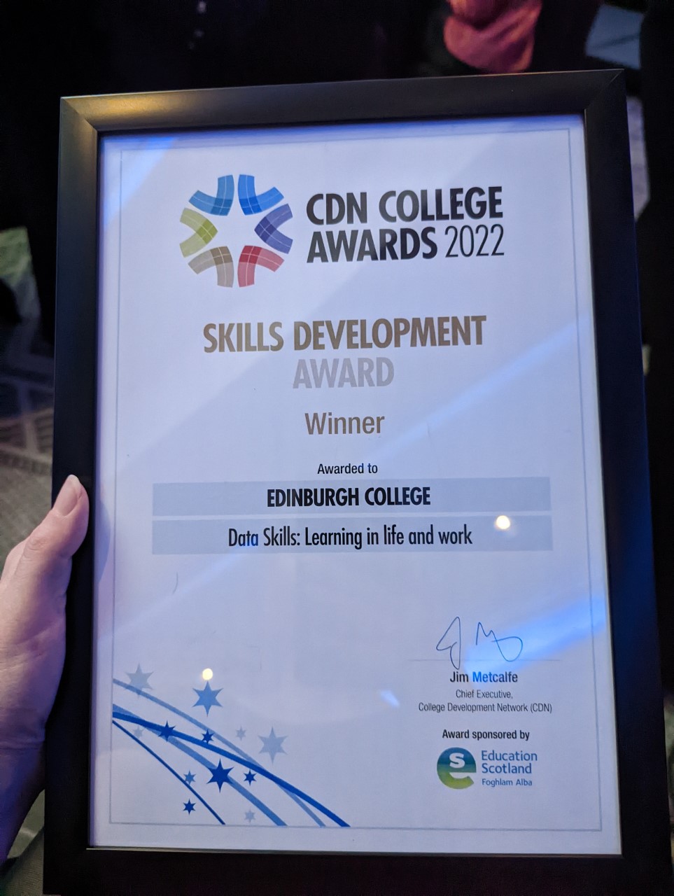 The award was for the Data Skills: Learning in Life and Work, in recognition of the portfolio of data courses which support unemployed people in Edinburgh and those on low incomes in gaining confidence in using digital techniques. The project is part of the Data Skills Gateway skills programme.