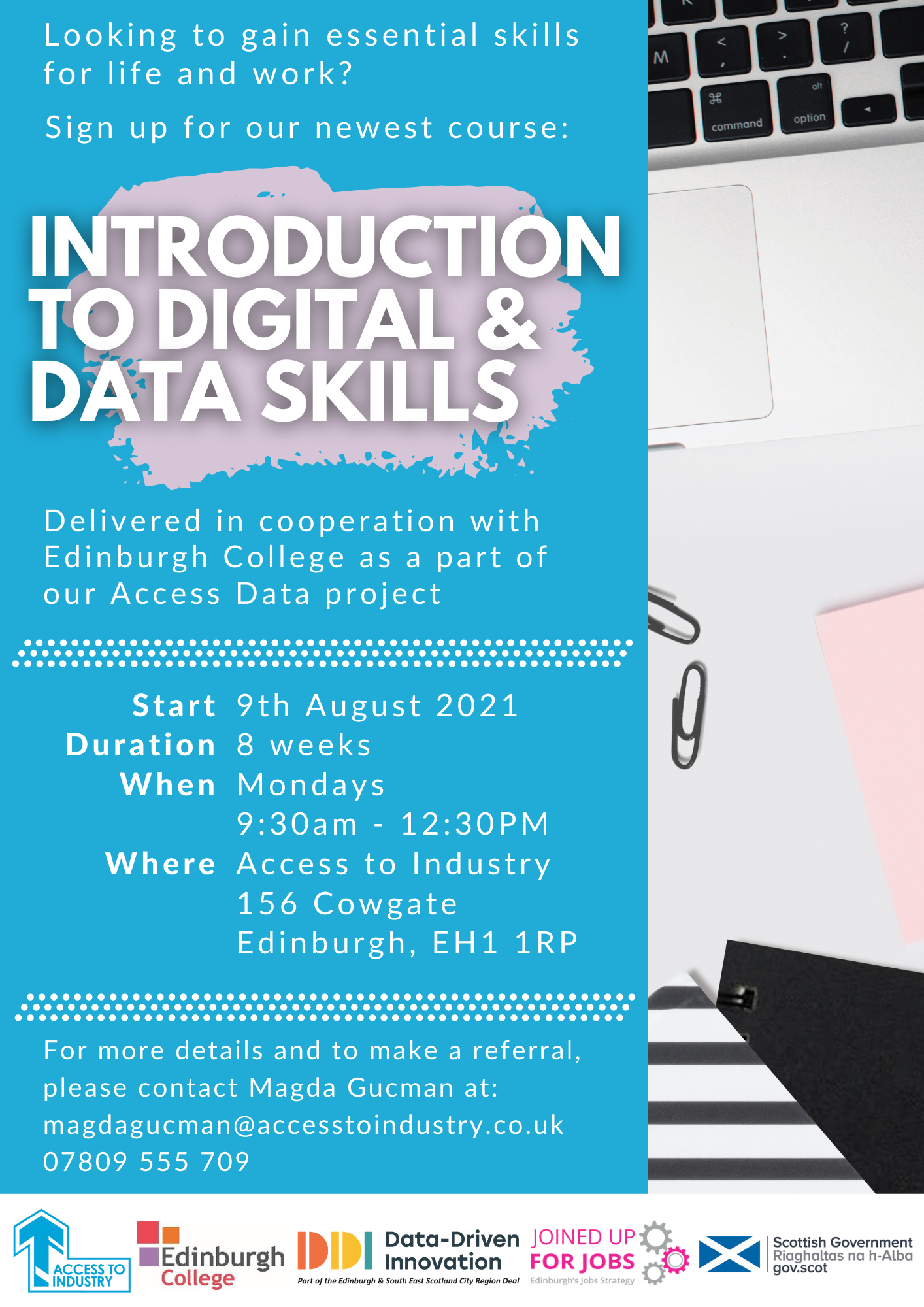 The course is fully funded and accredited. It will be delivered in cooperation with Edinburgh College in our 156 Cowgate Community College over 8 weeks, from 9th August until 27th September 2021, on Mondays from 9:30 am to 12:30 pm.