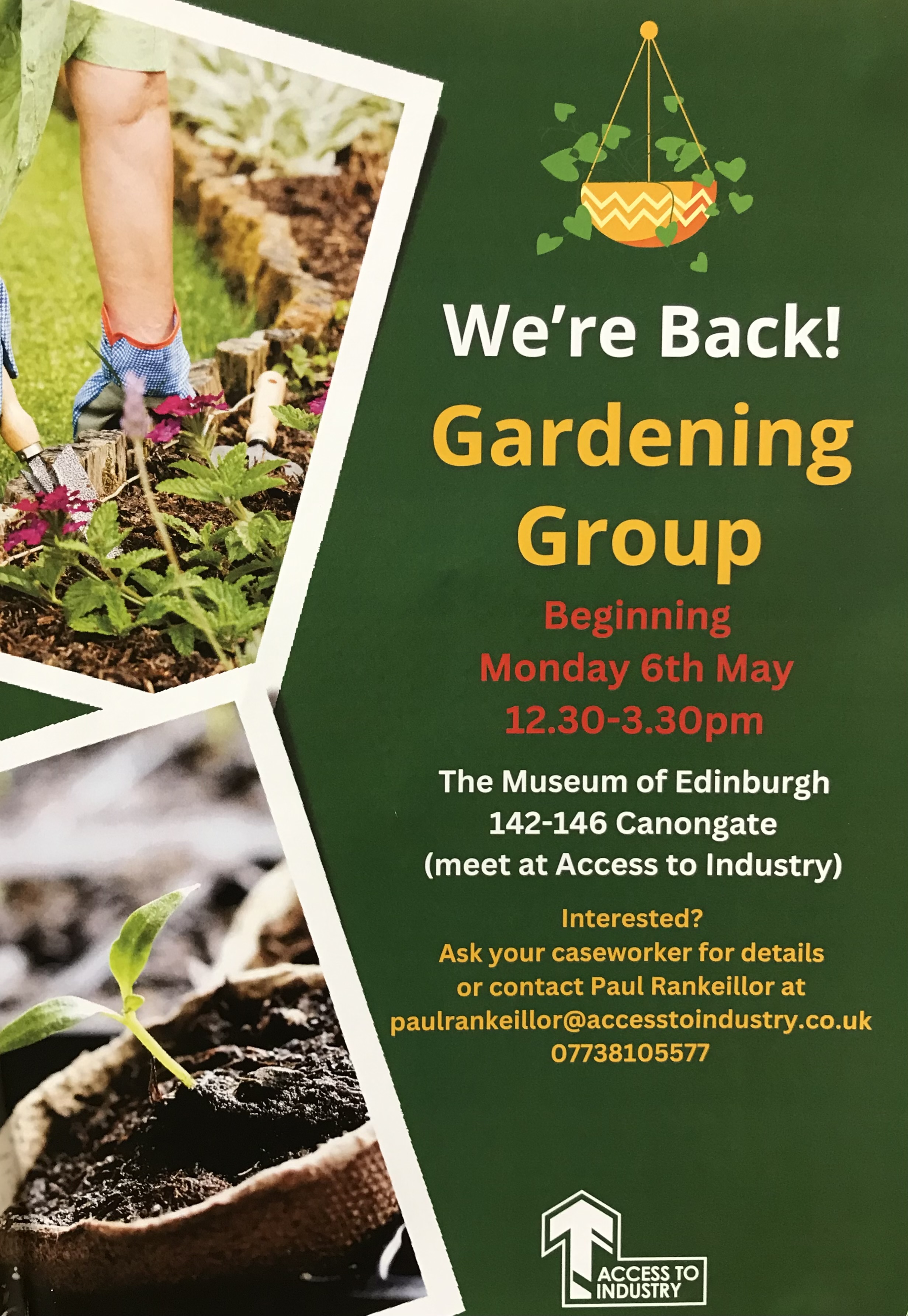 The group will run throughout the summer, and into autumn. If you're interested in joining, ask your Caseworker for details, or contact Paul on paulrankeillor@accesstoindustry.co.uk. Poster below: